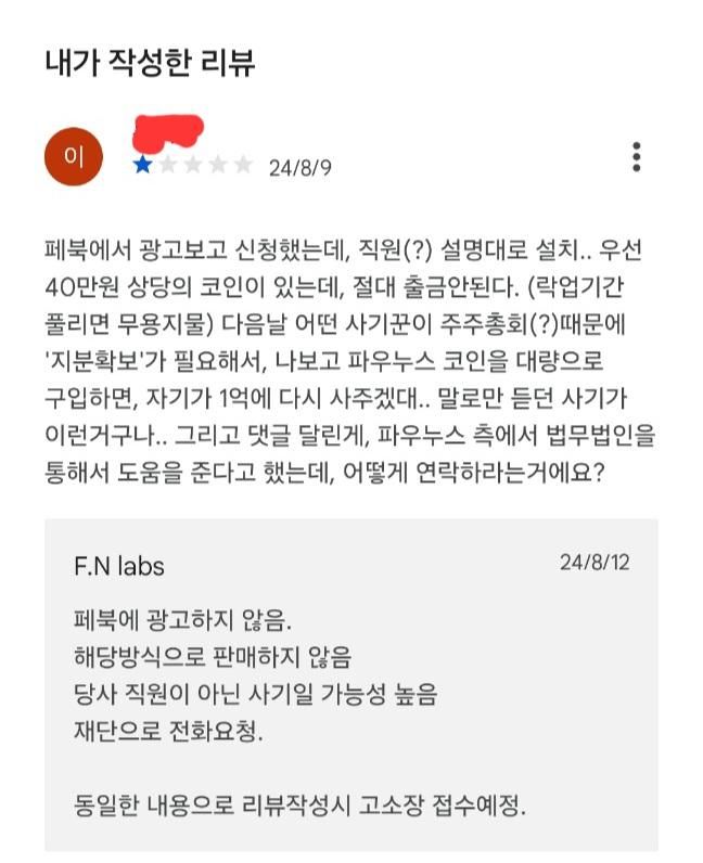 그래서 해당 앱에 제가 이런 글을 올렸더니, 답변 마지막에 '동일 내용 리뷰시 고소 예정'이라고 하더군요.
