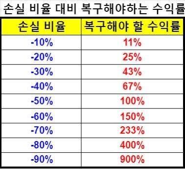 만약 삼성전자 지수가 1만일때 a원을 투자했을시 지수가 10프로 떨어지면 9천이고 만약 여기서 10프로 다시올라가면 9천9백이므로 원금을 유지할려면 10프로초과로 지수가 올라야 1만으로 가서 원금회복인가요?