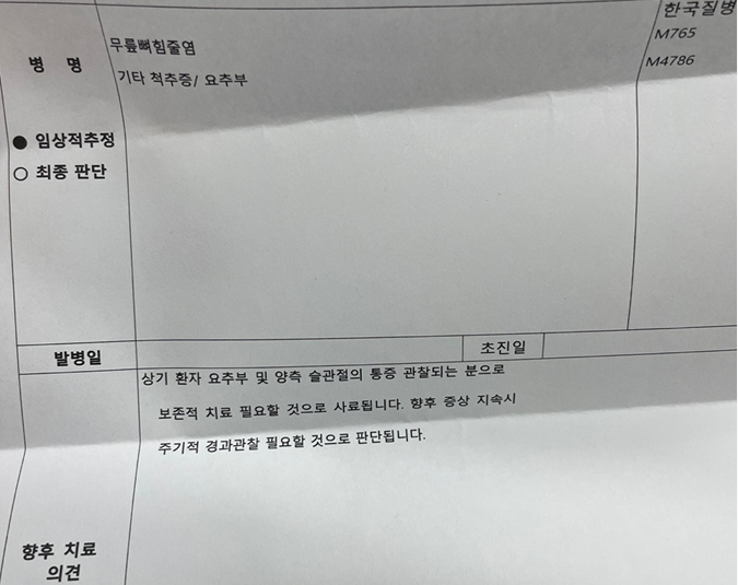 진단서에는 허리 디스크 (= 요추추간판탈출증) 으로 정확히 진단된 것은 아닙니다. 무릎힘줄염증 과 요추통증 정도로 광범위한 진단명이 기술되어 있습니다. 추간판 탈출은 MRI 등의 정밀진단을 통해서 정확한 진단이 가능합니다.