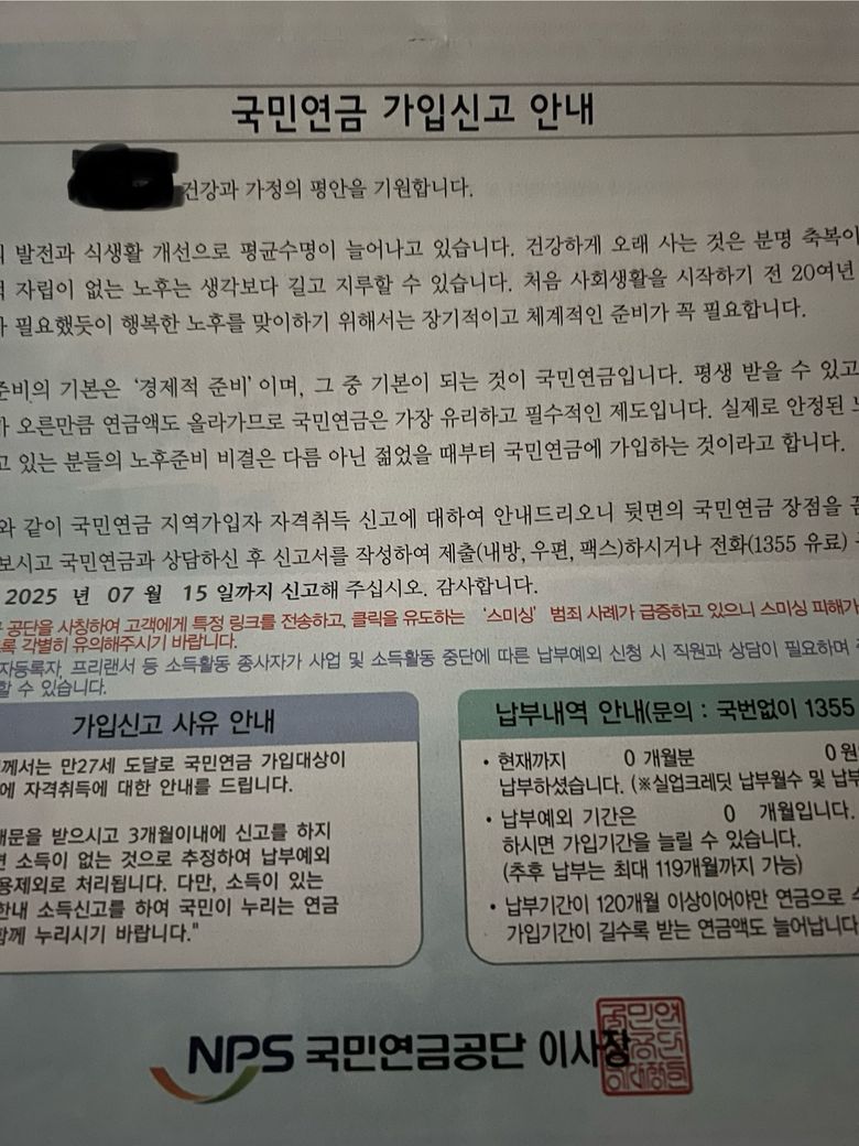 국민연금 가입신고 안내 우편이 왔어요