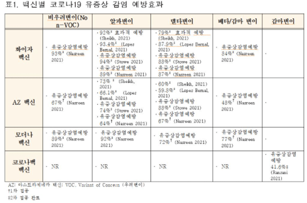초기유행주와 변이주에 대한 각 백신의 예방률입니다.