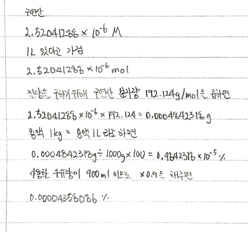 대학교 실험 실습 후 교수님이 우유에 넣었던 구연산이 0.04%인 이유를 산 해리상수 계산법으로 계산해 레포트를 제출하라고 하시는데