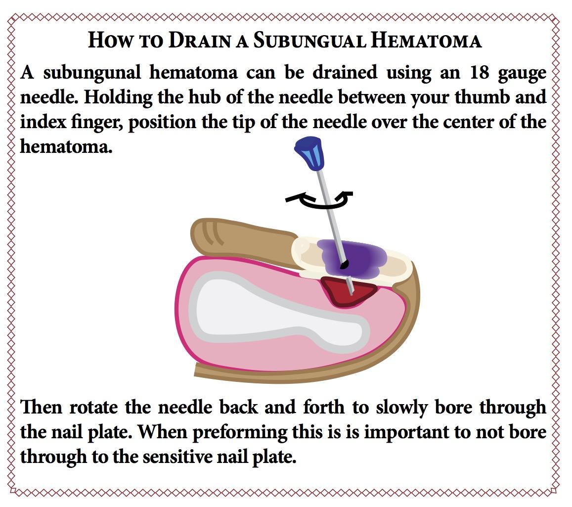 발톱 아래 출혈이 생기고 이로 인해 통증이 있다면 고인 피의 제거가 필요한 경우가 있습니다.