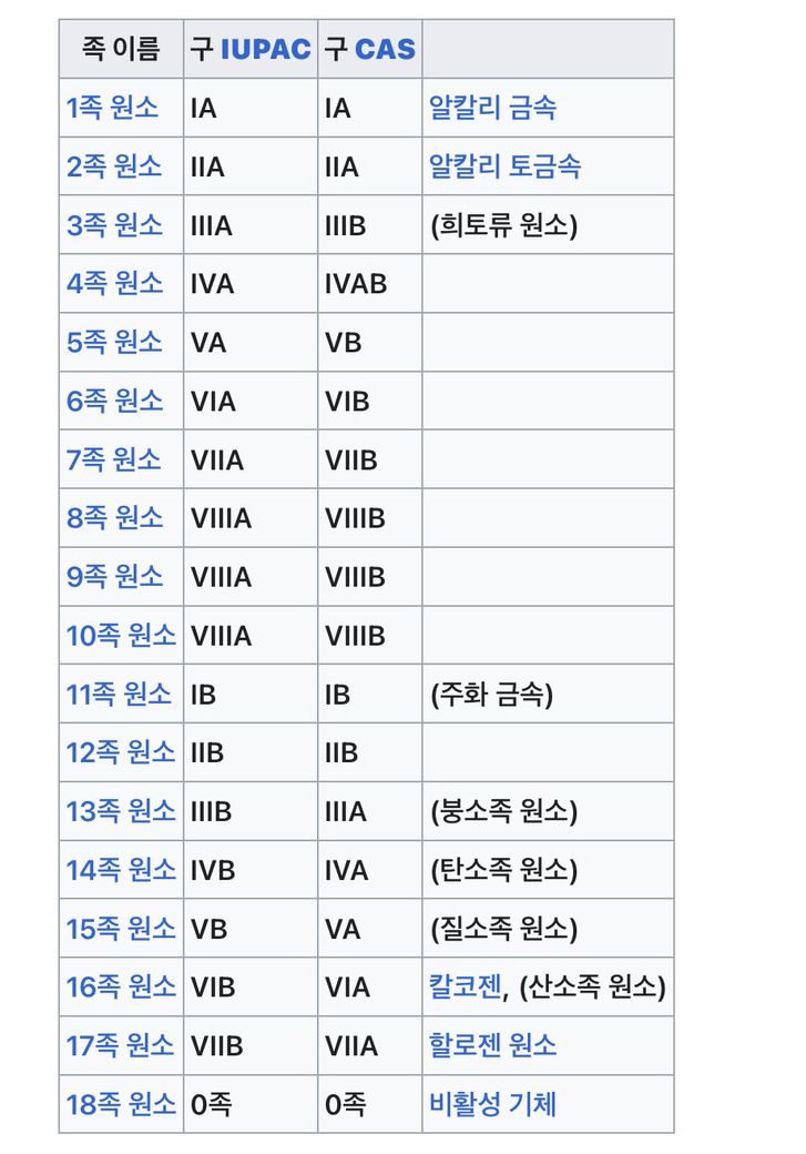 통합과학 1학기 시험을 마치고 탐구활동을 하는 중입니다 학교 교과서에서 같은 족끼리는 같은 화학적반응이 있다고 하여 교과서엔 다루지않은 1족14족17족18족을 제외한 족들을 탐구하려는데 정확한 명칭이 없는 족들도있어서 왜그런건지 궁금합니다