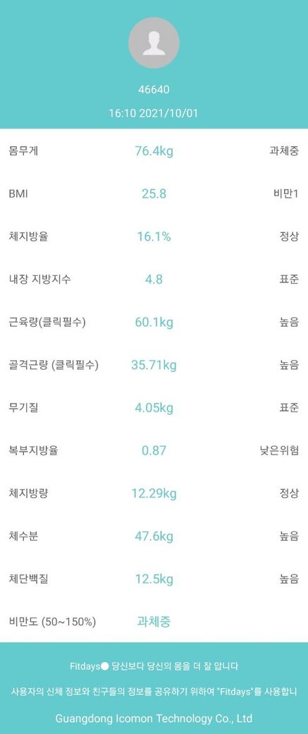 질문하신 내용에 대하여 아래와 같이 답변 드립니다.체지방이 낮고 근육량과 수분량이 정상적인 것으로 보아 과체중 중에서도 경미한 것으로 보여집니다. 단순히 운동 및 식이만 약간 조절하신다면 정상체중으로 돌아오면 크게 걱정하지 않으셔도 될 것으로 보여집니다.