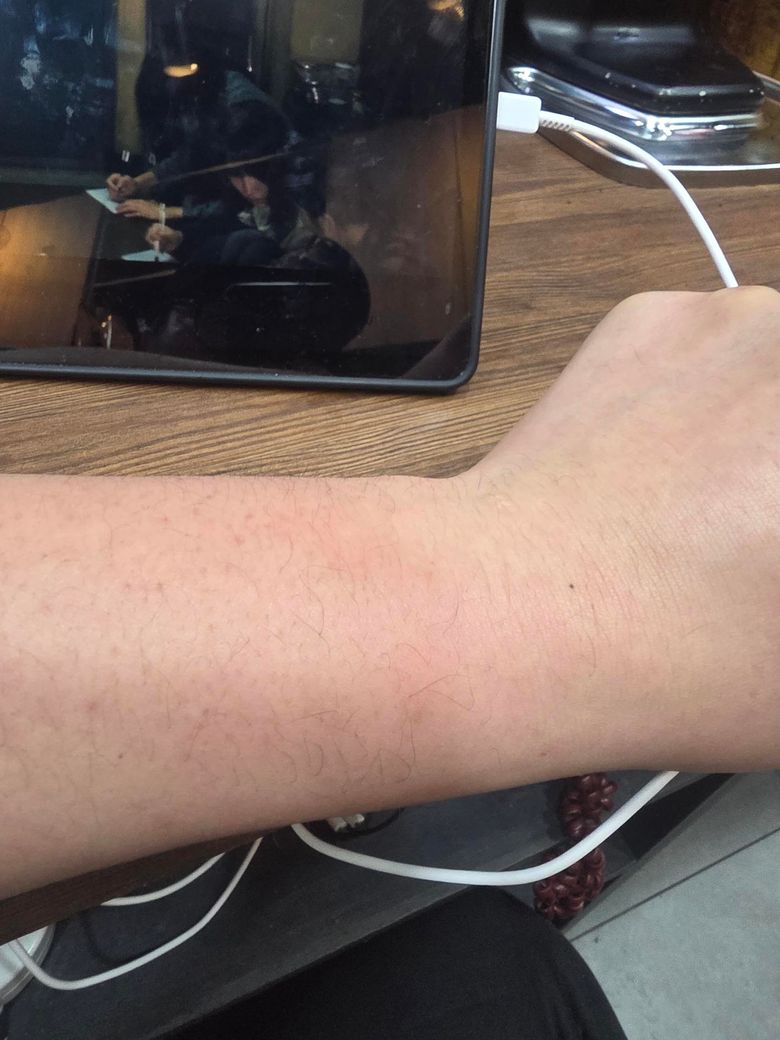 팔목에서 팔꿈치 까지 열감과 붉게 변함