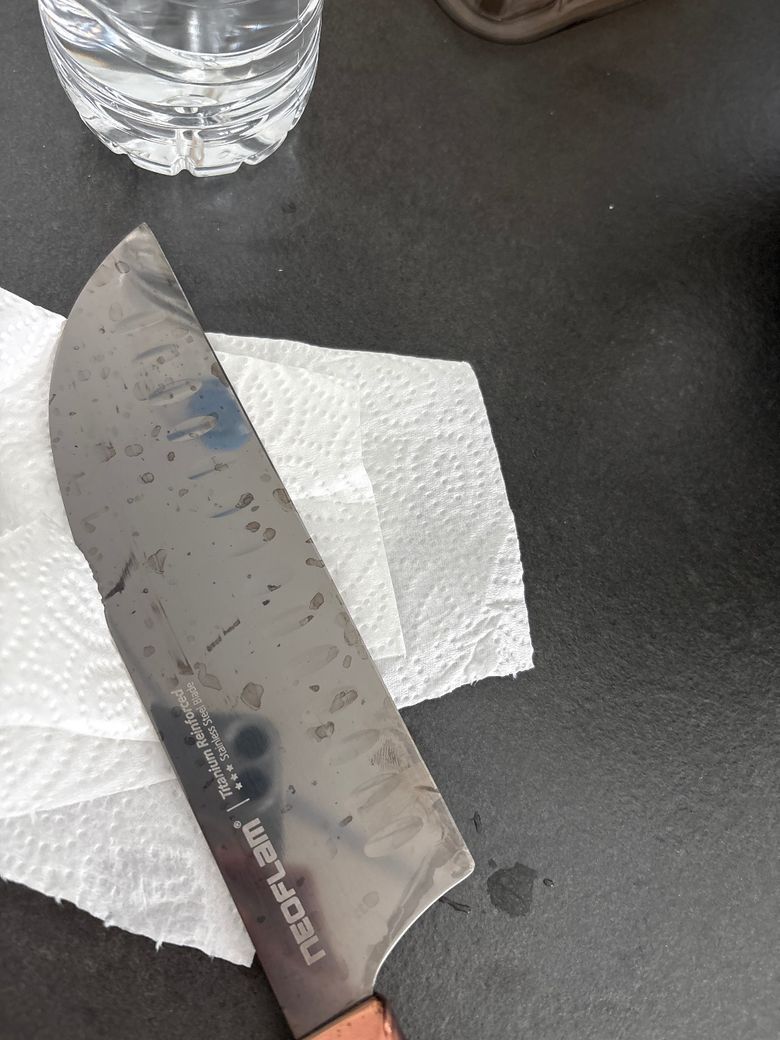 스테인리스 칼에 생긴 얼룩은 물때, 산화막, 또는 세척 잔여물 때문일 가능성이 큰데 식초로 세척하고나 레몬이나 감자로 문지르면 됩니다.