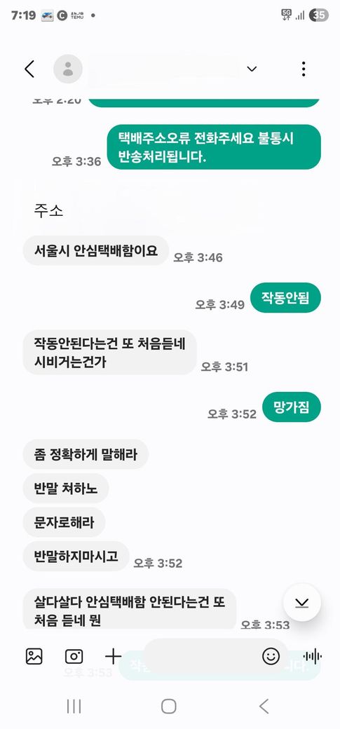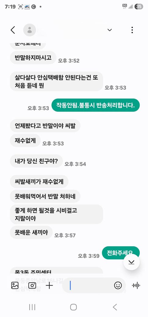 그중 한 고객님께 사진과 같이 "작동 안 됨" ,"망가짐”이라고 답장를 보냈습니다.
