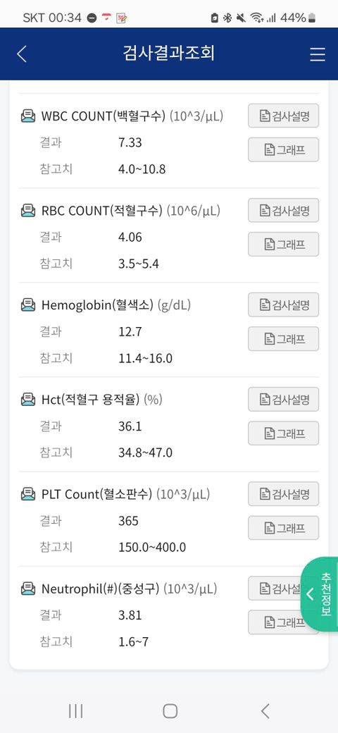 백혈구(WBC) 수치가 정상이라 하더라도 호산구 수치가 정상인지 여부는 별도의 백혈구 분획 검사(WBC Differential)를 통해 확인해야 합니다. 백혈구는 호중구, 호산구, 림프구 등 여러 유형으로 구성되며, 이들 각각의 비율은 백혈구 분획 검사를 통해 파악할 수 있습니다. 첨부하신 사진에는 호산구 수치가 없습니다.