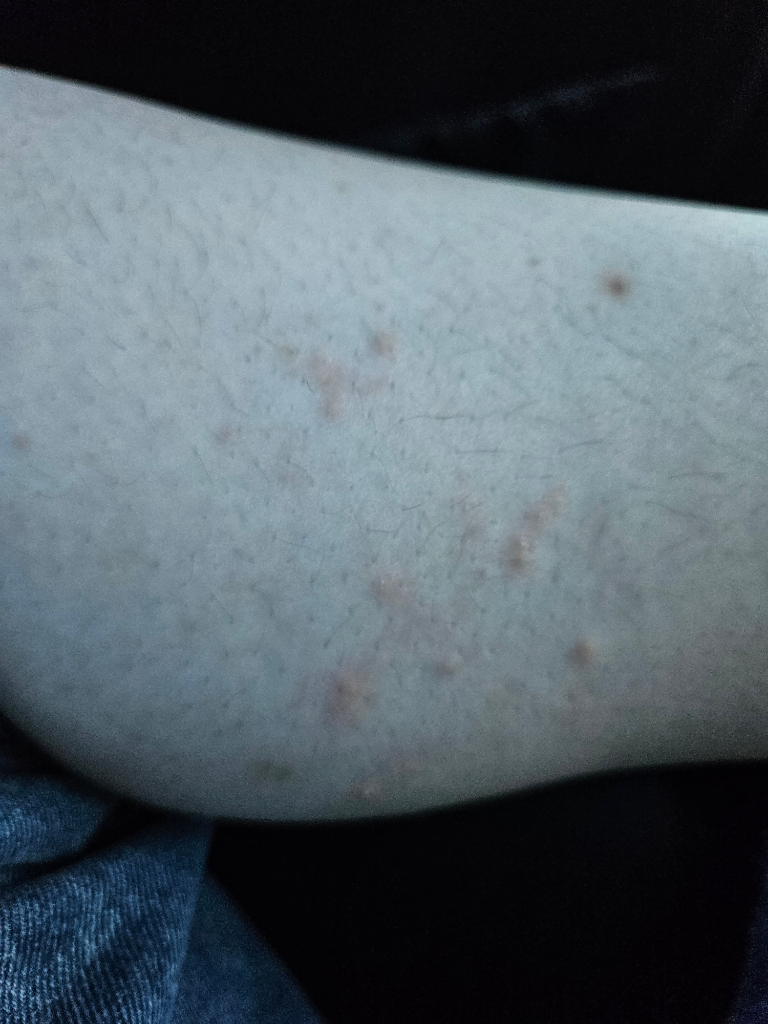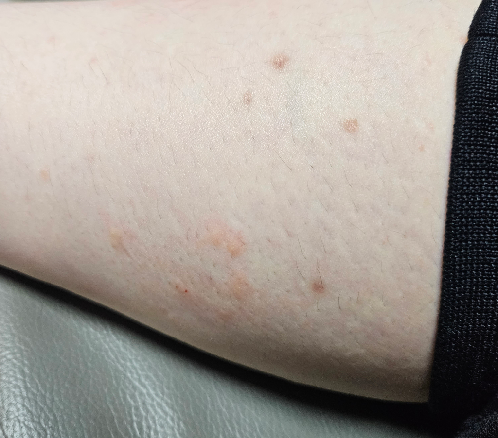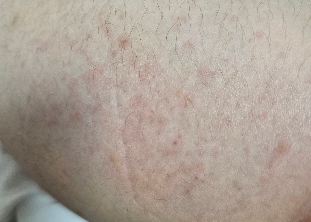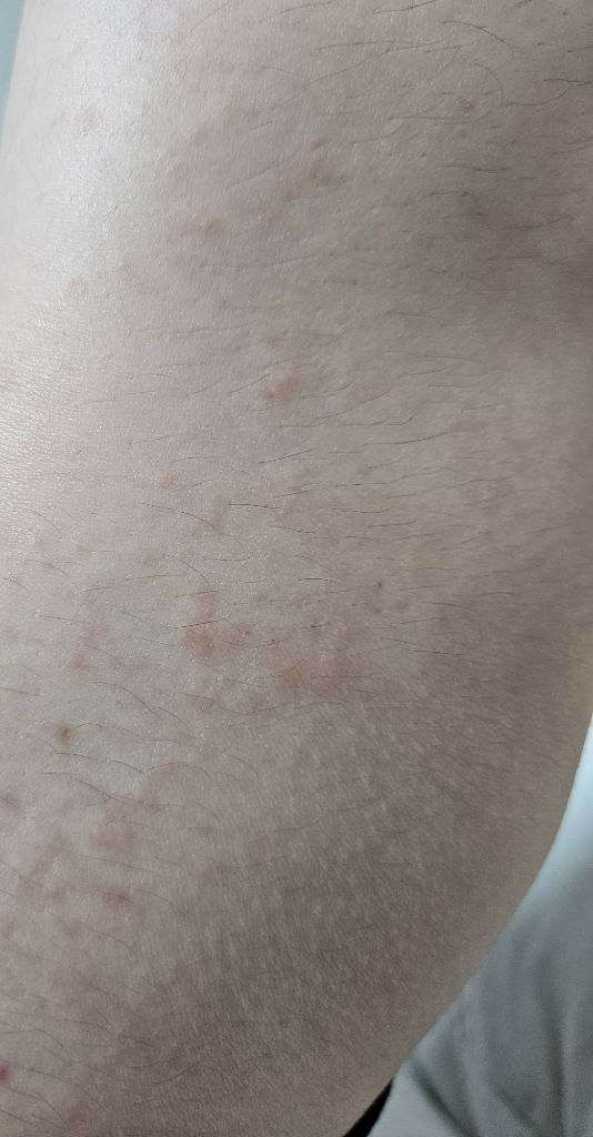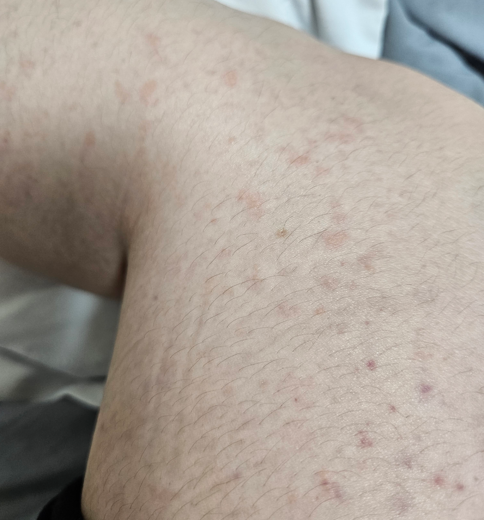 둘 다 가능성이 있어보입니다. (두드러기 처럼 보이는 병변도 있고)