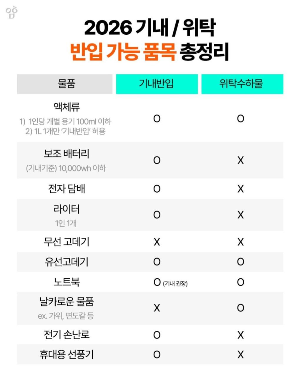 액체류 외에도 물품 반입 가능 품목은 밑에 사진 참고 부탁드립니다. 즐거운 여행되세요.