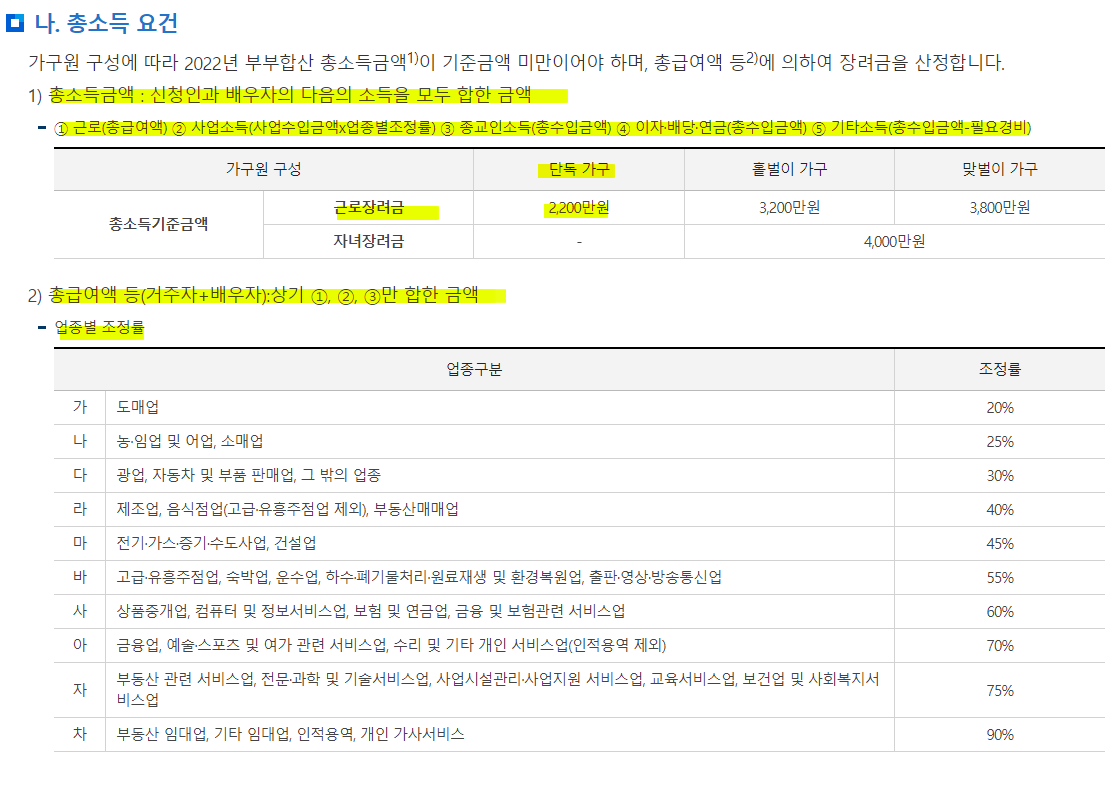단독가구일 경우 연간 소득이 2,200만원이어야 합니다. 이는 근로소득(총급여) + 사업소득(사업수입금액 x 업종별조정률)을 합친 금액을 의미합니다. 자세한 요건은 아래 국세청 사이트를 참고하시면 됩니다.