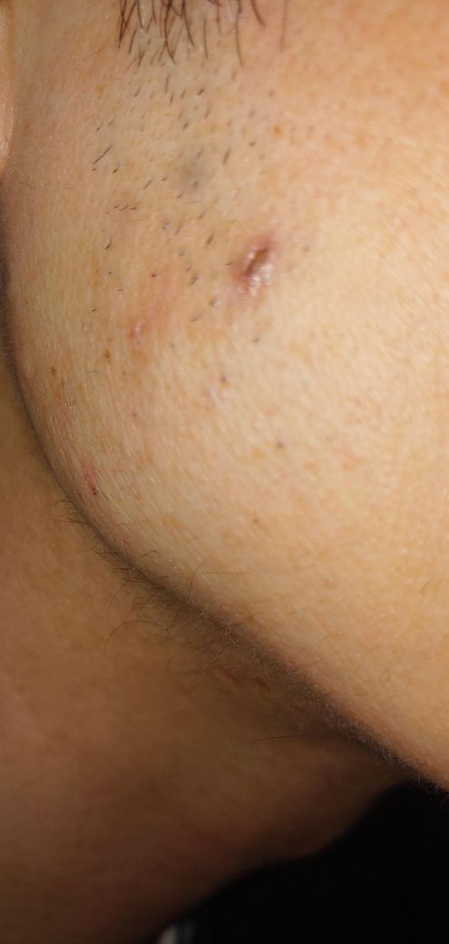모낭 주변의 만성 염증이나 감염된 모낭염 이후 변화로 보입니다. 1개월 이상 지속되는 병변이라면 단순 뾰루지나 경증 모낭염은 아닐 가능성이 높습니다. 손으로 털을 뽑은 후 세균 감염이 발생했을 수 있으며 그에 따른 만성 염증이거나 흉터화일 수 있습니다. 자연 치유가 안 되고 지속 중이라면 피부과 진료가 필요하며 필요시 절개배농이나 항생제 치료, 조직검사를 고려해볼 수 있습니다.