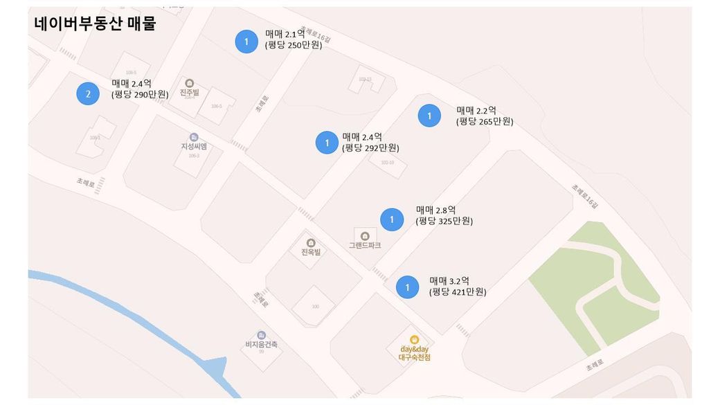 대구 동구 숙천동 14 천년나무 4단지 위쪽 택지 평당 250 ~ 290만 원 매물은 급매일 가능성이 큽니다.