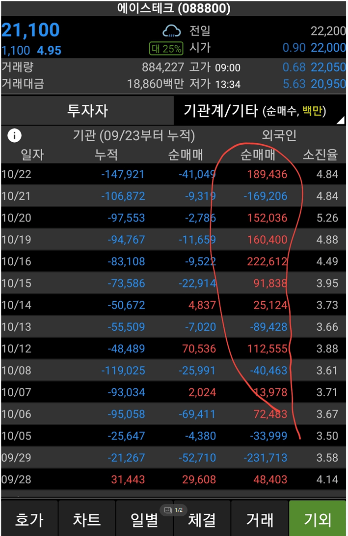 그나마 집나간 외국인들이 조금씩 사면서 하락 방어를 조금씩 조금씩 해주려는 수급입니다.