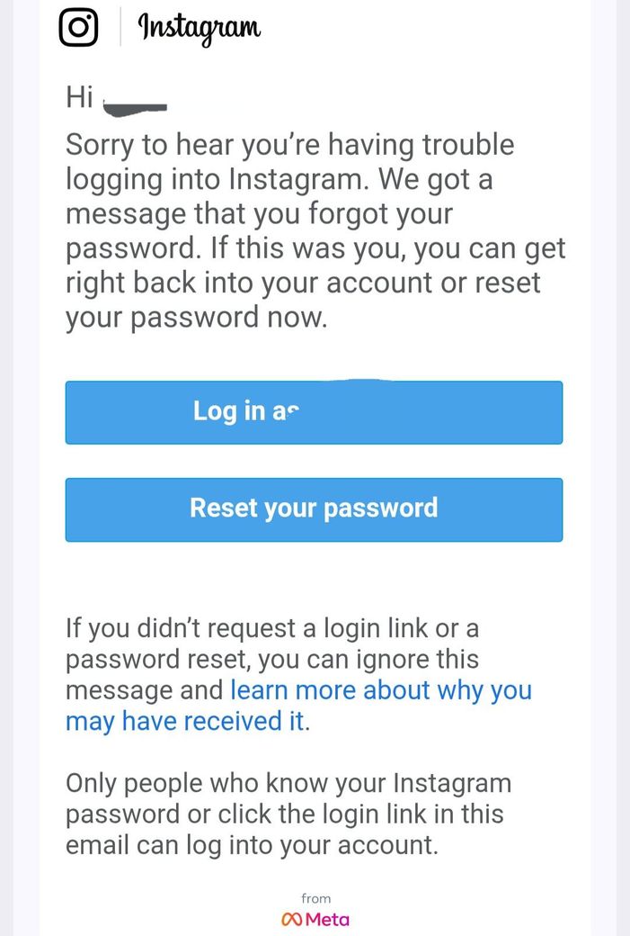 이미지 내용은 “비밀번호 재설정 요청이 들어왔다”는 안내 메일 형태로, 실제 Instagram에서 보내는 정상 템플릿과 매우 유사합니다. 다만 이런 메일은 “본인이 요청했는지 여부”가 가장 중요합니다.