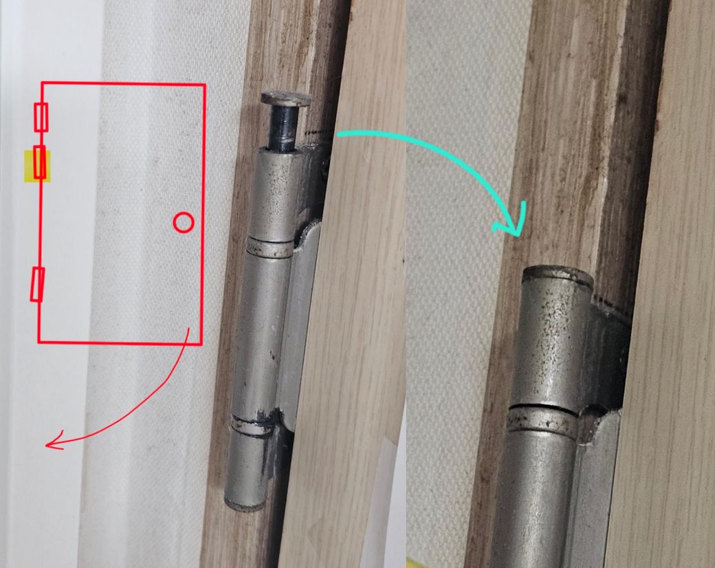 사진 봐주시면, 빨간색으로 그린 문 경첩 중 노란색 부분이 왼쪽처럼 튀어나옵니다.