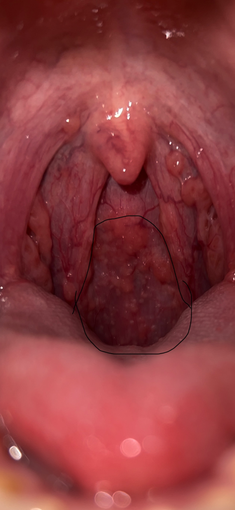 두번째 사진입니다. 식도로 내려가는 후두? 쪽 동그라미 친 곳에 하얀 작은 점같은게 있는데 이것도 편도염에 일종일까요?
