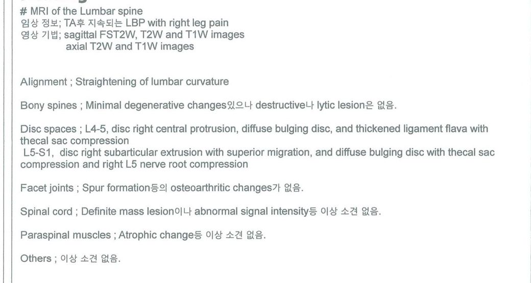 이 MRI 소견서 해석쫌해줘요 ㅠㅠ 디스크