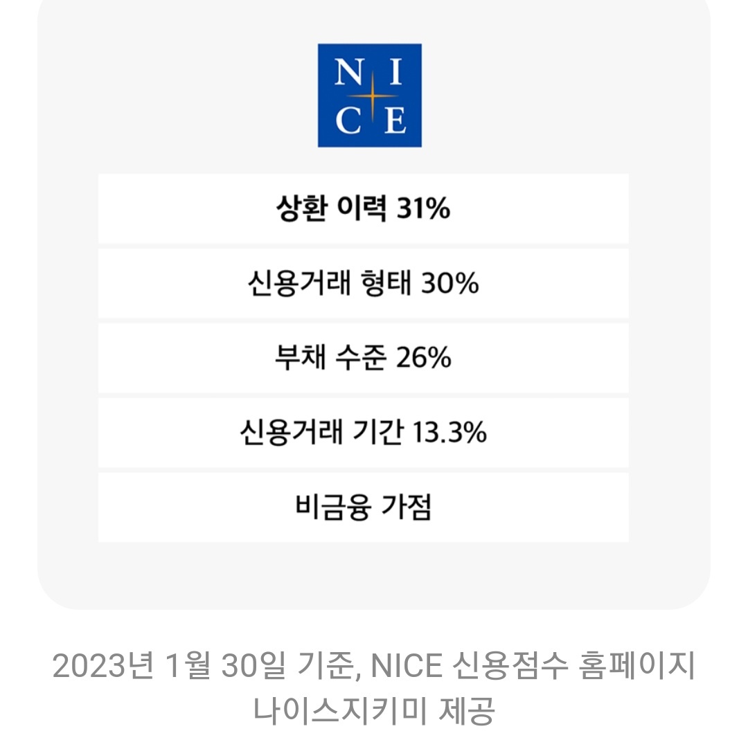 신용평가사의 신용평가 항목과 기준 및 그 비중은 조금씩 변동될 수 있기에 정확히 알려면 해당 평가사 홈페이지를 확인해 보시는 것을 권합니다.