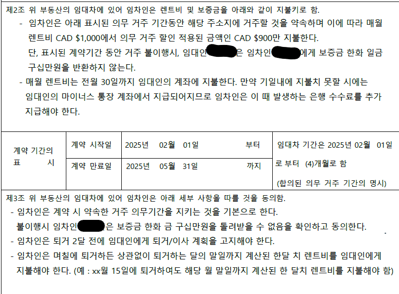 현재 캐나다에 워킹홀리데이로 와있으며, 한국인 임대주(영주권자)와 룸렌트 계약을 진행하였습니다.