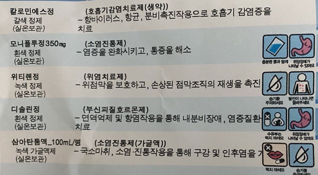 위 약중 스테로이드가 소염작용을 해줍니다. 또한, 생약제제인 칼로민에스도 소염작용을 해줍니다.