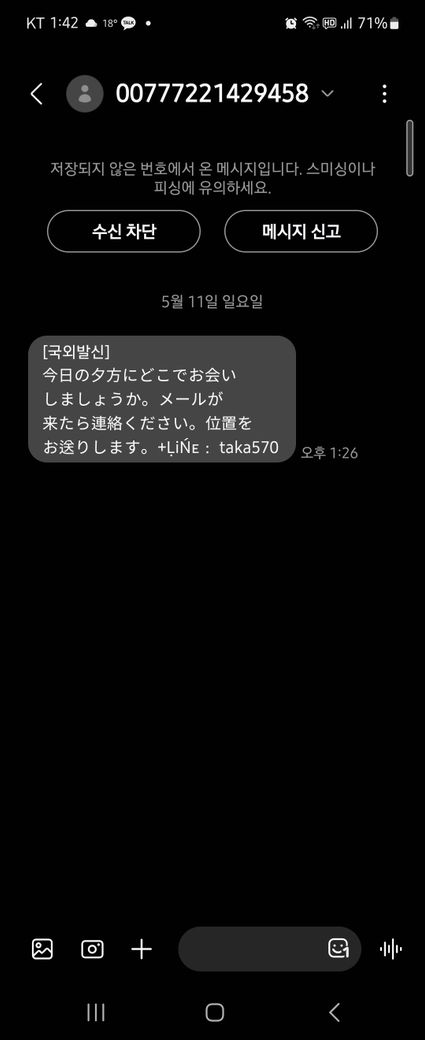평점하게 있었는데 갑자기 일본어로 메세지가 날라왔습니더. 007로 시적하는 매세지인데 내용은 오늘저녁에 어디서 만날지 물어보고 알려준다면서 라인으로 유도하더라구요 이거 성매매등등의 범죄에석하는걸까요? 메세지를 신고해두긴했는데.....