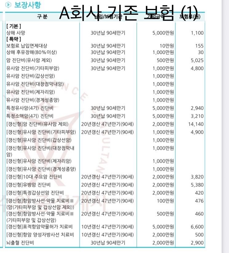 기존에 있던 보험 증권을 쭉 살펴보니 암진단금이 다소 부족해 보입니다.
