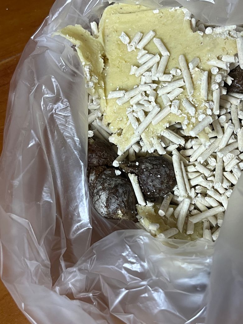 똥의 습기에 모래가 녹아서 묻은 후 굳은것으로 보입니다. 그 자체로는 문제가아닐 가능성이 더 높습니다.