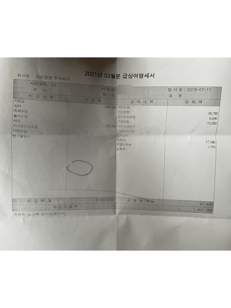월급명세서도 이번에 준걸 마지막으로 할것이다. 우리가 돈떼어갈것같냐면서, 우리가 더 주면 더 줬지