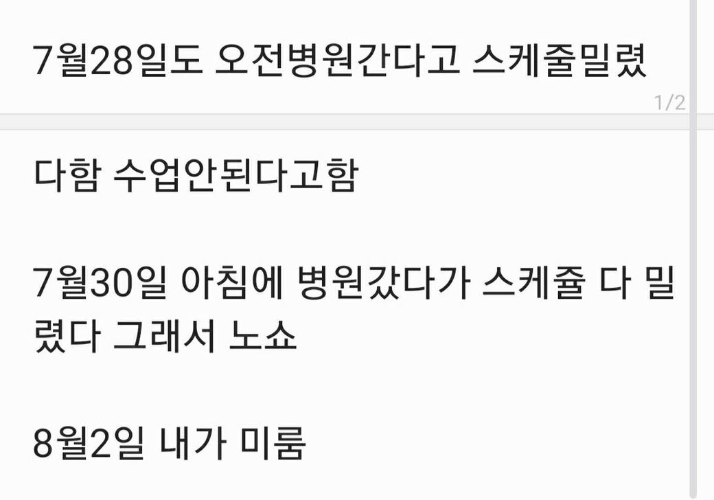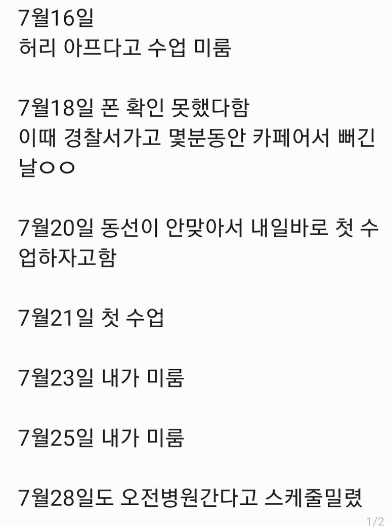대충 이런상황이였습니다. 이선생님 너무 연락도잘 안되고 답답해서 그만둘려는데 당일취소가 많아서 전액환불은 안된다고 하더라구요. 수업한것도 아니고 취소한것도아니고 미룬건데... 어떻하죠?
