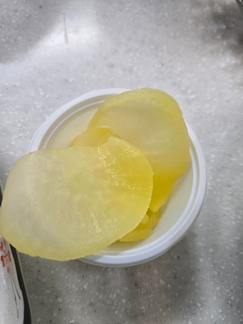 단무지가 노란부분과 하얀부분이 동시에 존재해요 오늘 산거고 뜯어보니 단무지가 색소가 빠져있는데 먹어도 괜찮겠죠? 사진 남겨놓을게용!