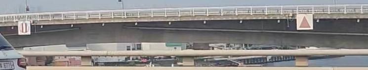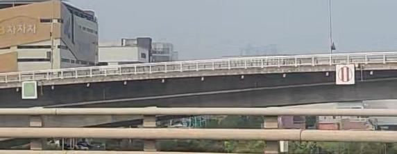 김포 하나교 다리 난간 옆에 있는 초록색 네모, 빨간 줄무늬 동그라미, 빨간 세모 표지판은 각각 안전 및 경고 표지판으로 보입니다.
