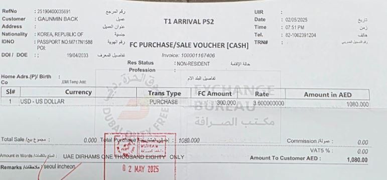 사용한 330디르함제외하면 차액 750디르함 1080디르함 사용한게맞는데