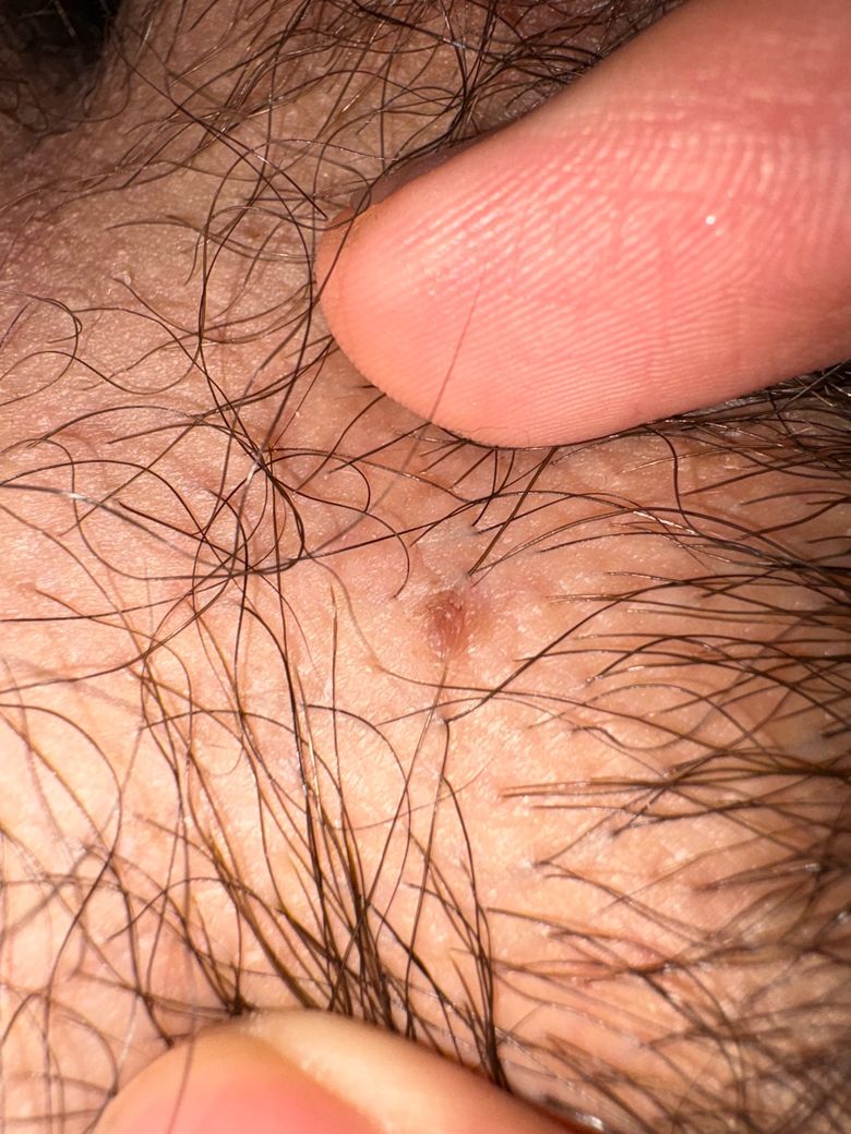직접적인 성기부위는 아니고 성기 옆 음모로 덮힌부분 입니다 크기는 쌀 한톨 좀 안되는정도입니다