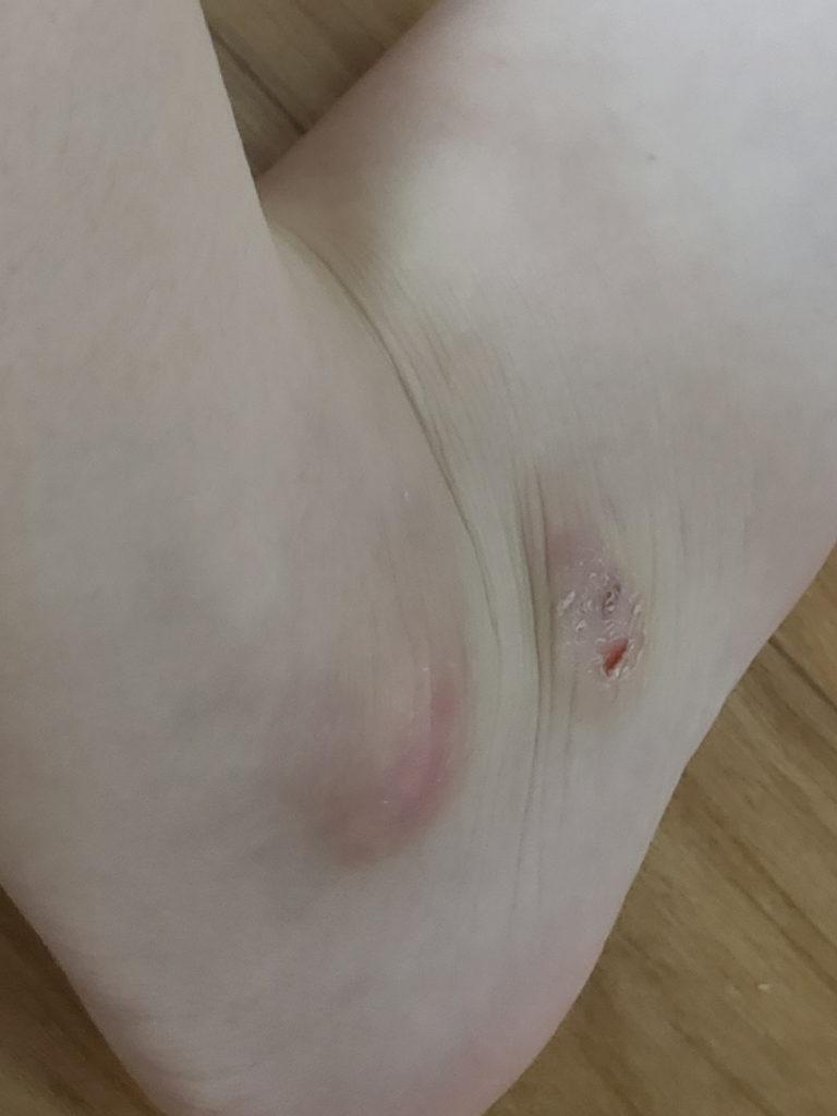 사진에서 보이는 발목 부근의 상처는 피부 찰과상과 중앙에 열린 상처가 있는 것으로 보입니다. 상처가 있는 쪽으로 바닥에 닿으면 아픔을 느끼는 것 같습니다. 이러한 경미한 상처는 적절한 가정 치료를 통해 자연스럽게 치유될 수 있습니다.