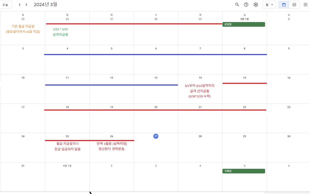보시는 바와 같이 14일 입금된 금액은 8일간 근무한 내용(푸른 선) 에만 입금되었으며, 나머지 차액(붉은 선) 은 현재 이 글을 작성하는 시점에도 입금되지 않았습니다.