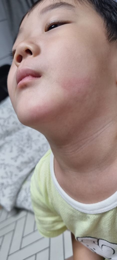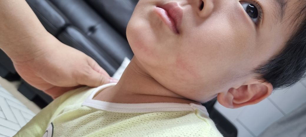 가렵지 않다면 피부염(세균 감염)일 가능성도 고려해야 될 것 같습니다. 만지면 아플 것 같은데요. 소아과에 가셔서 진료를 받고 약 처방을 받으시면(항생제) 좋겠습니다.