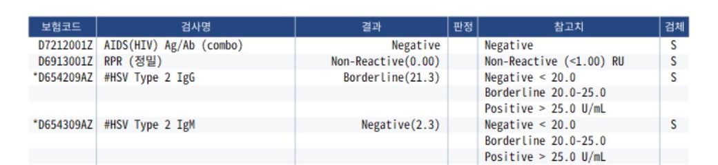 검사 결과를 보면 HSV type 2 IgG가 21.3으로 ‘경계 범위(20.0에서 25.0)’에 해당하고, IgM은 음성입니다. 이 경우를 단순히 양성으로 확정하기는 어렵고, 현재 해석은 ‘불확실’ 또는 ‘판정 유보’가 맞습니다.