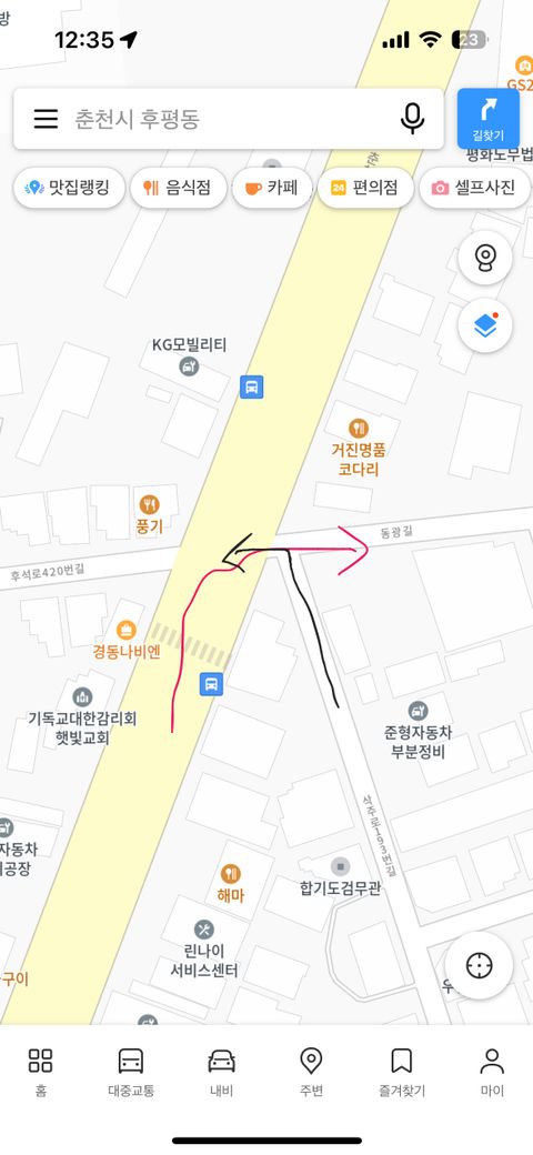 제가 핑크색 화살표처럼 우회전하는 상황이였고 상대방은 검은색 화살표처럼 나오다가 사고가 났습니다. 저희측 보험회사에서는 저희가 대도로에서 소도로로 진입하는 상황이고 상대방은 소도로에서 대도로로 나오는 상황이라 저희에게 우선권있어 우리가 피해로 주장할 수 있다고 말씀하셔서 그런줄 알고 있었는데 상대측은 자신이 피해자이고 자신의 차량은 직진차선이며 자신의 차량이 먼저 진입하였다라고 주장합니다. 저기 차선이 이상한 것이긴 하지만 어떻게 저게 직진 차선으로 될 수 있는거죠,,? 블랙박스 확인해보면 상대방차량이 좌측 깜빡이를 키고 있는것도 확인할 수 있습니다. 저희측에서는 누가 먼저 진입했다라기보다는 동시 진입으로 보고있습니다. 둘 다 잘못이 있다고 생각하긴 하나 저희는 왕복 4차선 도로 vs 상대측은 골목길로 저희가 피해로 보고있는 상황인데 상대측 보험회사랑 도저히 대화가 통하질 않아 저희 보험회사 담당자분은 분심위를 가자는 의견입니다. 상대측은 자신들이 피해라면서 50:50을 이야기하는 것도 어이없고요,,, 제가 정말 가해자인가요,,,? ㅠㅠㅠ