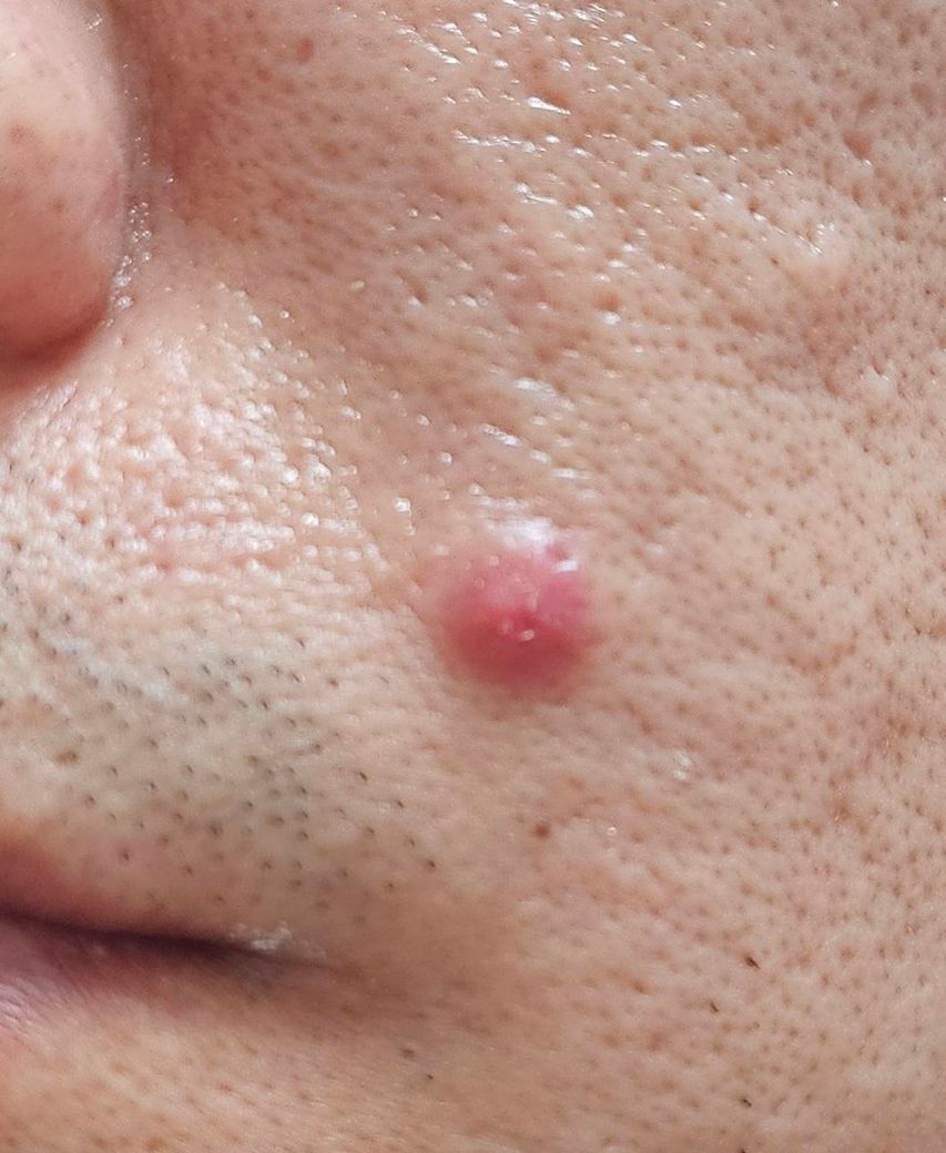 사진상 농포가 터진 것으로 예상되는 부위 주변으로 발적이 동반되어 있어 국소 모낭염과 같은 염증성 피부 질환에