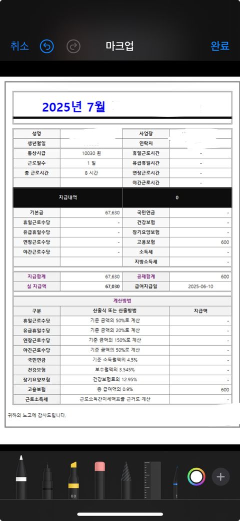 15일 일한 건 6월근무입니다(15일)7월은 하루 근무이고요(1일)담당자가 보냈줬다고 하는 데 받은 내역이 없습니다 전자문서서버스인데 받은 내역이 없습니다 그래서 209시간을 못 채운 후 사직하게 되었습니다 급여 중 월급제에서 일급을 환산한 수치는 하루 순수 8시간 근무일때 명세서에 일급제로 환산했을 때 67030원이 찍혔습니다