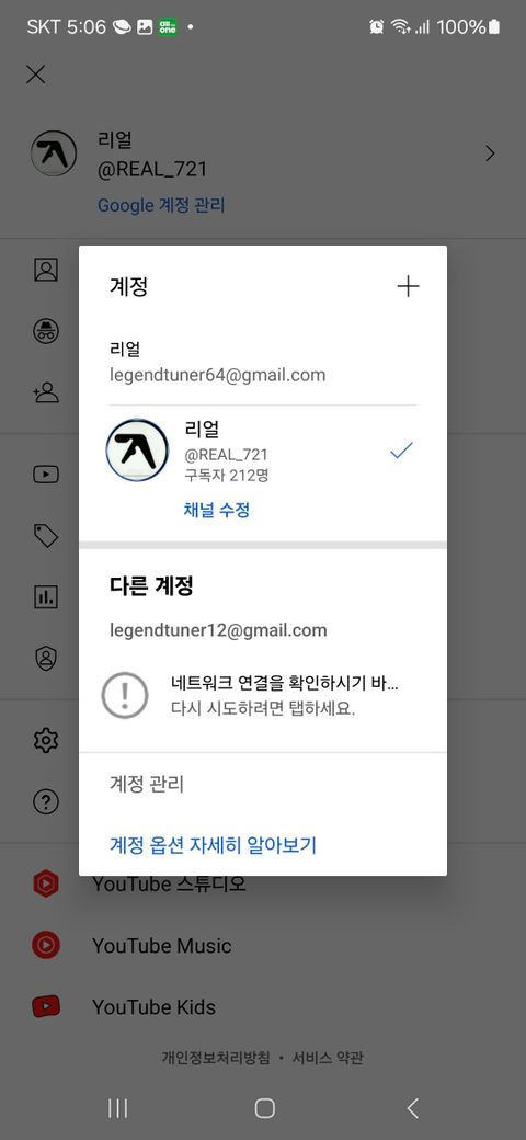 위와 같이 legendtuner12@gmail.com로 로그인이 안됩니다. legendtuner64@gmail.com으로는 됩니다. 근데 12로 로그인 해야 되거든요. 기존 유튜브 계정을 다른것으로 해도 저렇게 뜨네요. 해결법 좀 알려주세요.