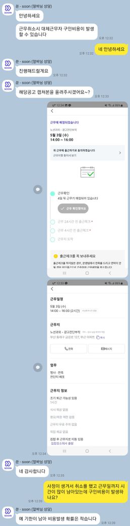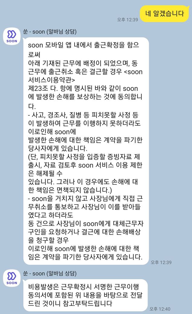 위와 같이 문의를 통해 답변을 받았습니다 soon이라는 어플 내의 서비스 이용약관을 말하면서 취소에 대한 비용을 요구한다면 제가 돈을 내야하나요?