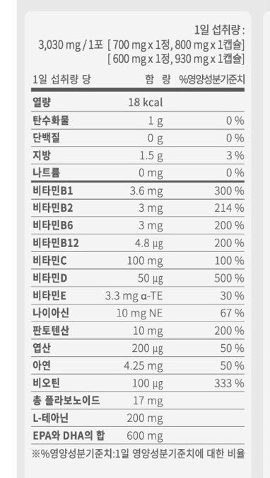 영양성분기준치의 %는 결핍 등을 막기 위하여 섭취하여야 하는 양에 대한 비율을 의미하는 것으로, 건강 기능 식품의 기능성을 나타내기 위한 양에 비하여 낮은 경우가 대부분입니다. 보통 피로회복, 에너지 생성 등에 도움을 주기 위하여 복용하는 비타민B군들은 현재 복용하고 있는 제품에 비하여 함량도 훨씬 높을 뿐만 아니라 활성형의 비타민들이 함유되고 있으므로 현재 제품들의 용량에 관하여 크게 걱정하지 않으셔도 된다고 생각됩니다.