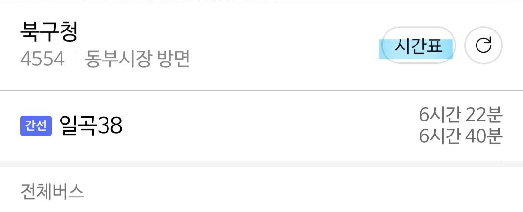 누르시면 자주다니는 버스는 2번째 버스가 언제오는지까지도 대략추측가능하구요. (지금 밤이라 버스끊겨서 6시간이라 나오네요) 오른편 시간표 누르시면