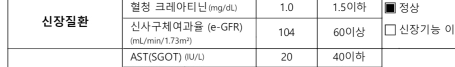 신기능 평가를 위한 크레아틴 검사를 받으셨고 현재 결과는 정상으로 큰 걱정은 하지 않으셔도 되겠습니다.