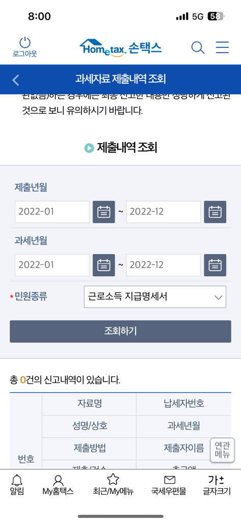 근로소득원천징수영수증을 조회하시려면 과세제출자료 조회 탭이 아닌 검색창에 근로소득지급명세서 조회를 하셔야 합니다.