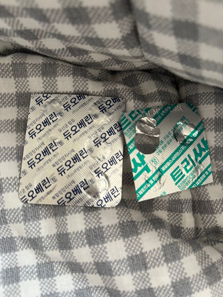 왼쪽의 듀오베린정이 설사를 멎게하는데 도움이 되며, 트리싹과 함께 복용하는 것이 증상을 빠르게 개선하는데 효과적입니다.
