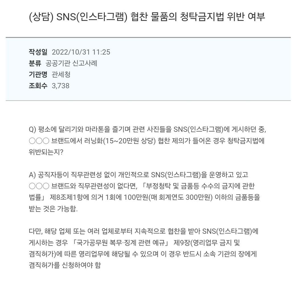 해당 공무원이 sns에 공연 관람 후기 작성하여 사례금을 임금받음